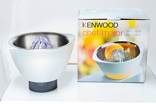 Dieulefit, France – September 4, 2011: The Kenwood citrus juicer attachment AT960 and the box in which it comes. It is compatible with the Kenwood Chef and Kenwood Major food mixers. The Kenwood citrus juicer attachment attaches to your food mixer, an accessory for extracting juice from citrus fruit. The Kenwood Chef, first available in 1950, is the most famous product of the Kenwood Company. The name Kenwood came from the founder of the original company, Kenneth Maynard Wood.