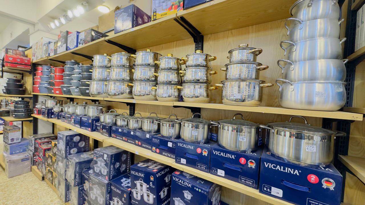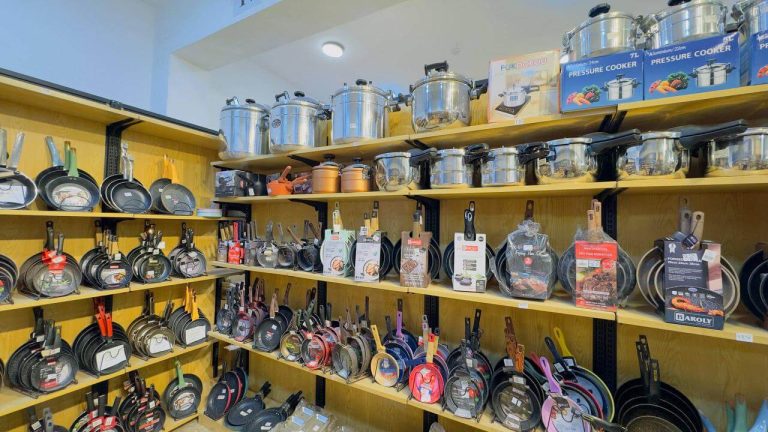 Set of black non-stick kitchen utensils on a white background. Pot, ladle, frying pan with glass lid.